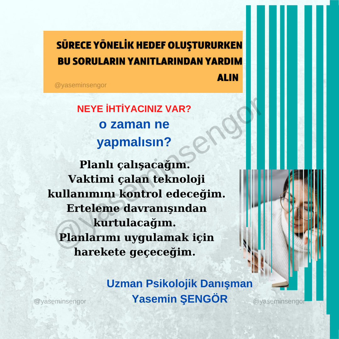 Planlı çalışacağım. Vaktimi çalan teknoloji kullanımını kontrol edeceğim. Erteleme davranışından kurtulacağım. Planlarımı uygulamak için harekete geçeceğim.