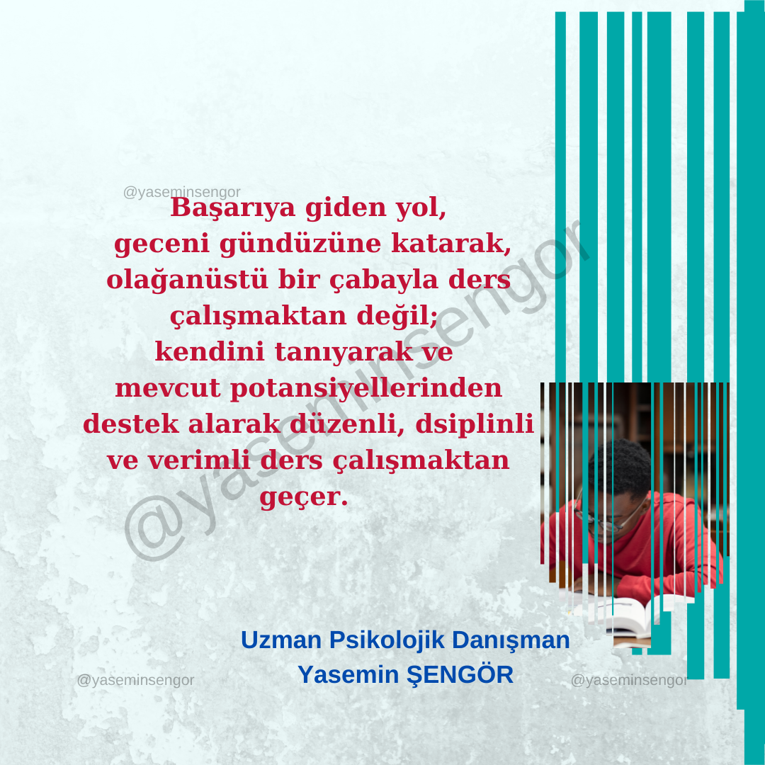 Unutmayın; Başarıya giden yol, geceni gündüzüne katarak, olağanüstü bir çabayla ders çalışmaktan değil; kendini tanıyarak ve mevcut potansiyellerinden destek alarak düzenli, disiplinli ve verimli ders çalışmaktan geçer.